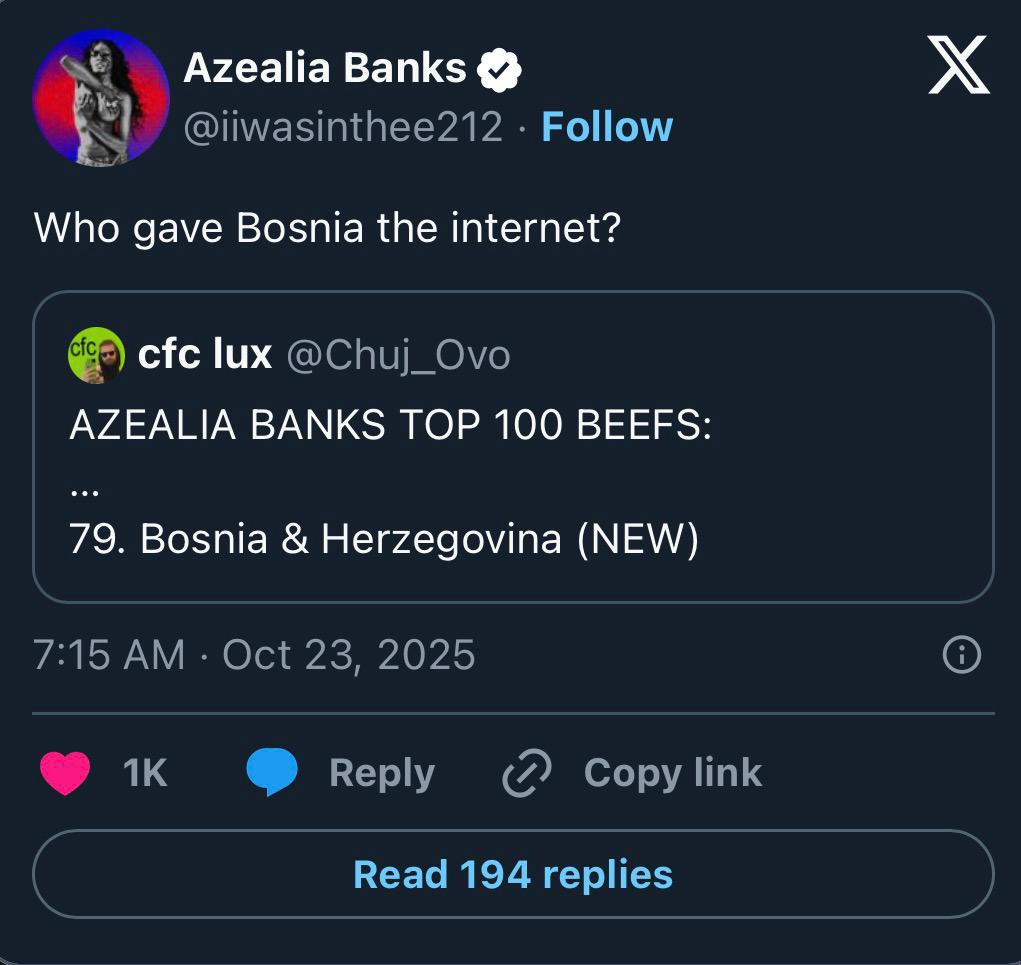 Poznata po svojim brojnim sukobima sa svjetskim zvijezdama, Banks se našla na udaru kritika nakon što je jedan korisnik platforme X objavio listu „100 najboljih svađa Azealie Banks“. Na toj listi završilo je i spominjanje naše države u negativnom kontekstu.